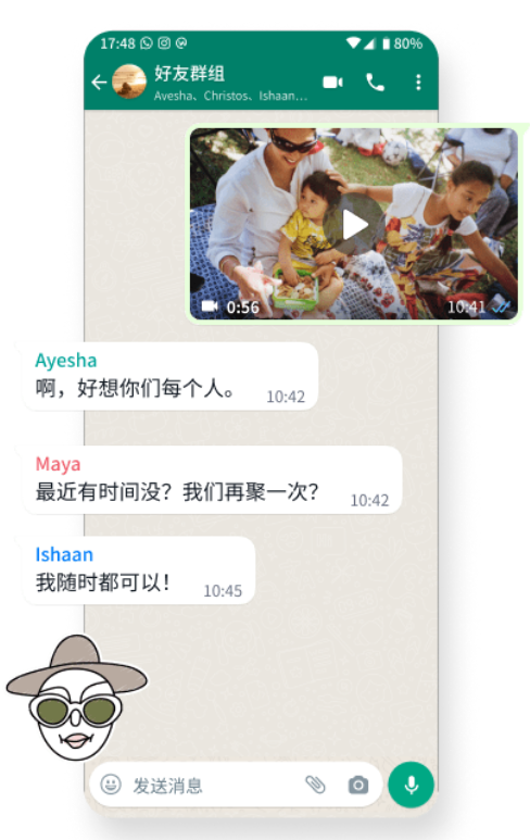 端到端加密让您的个人消息和通话更有安全保障。只有与您交谈的人和您自己可以读取或收听消息内容。除此之外,其他任何人(包括 WhatsApp中文版)都无法得知。